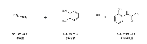 1.通过单氰胺和邻甲苯胺合成N-邻甲苯胍,收率约92%;