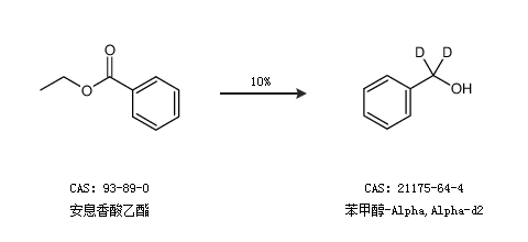 1.通过安息香酸乙酯合成苯甲醇-Alpha,Alpha-d2,收率约10%;