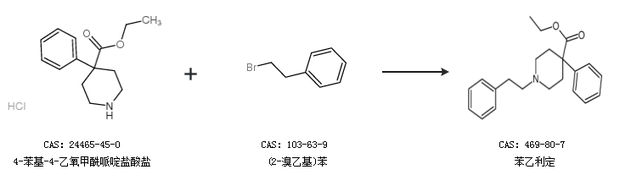 2.通过4-苯基-4-乙氧甲酰哌啶盐酸盐和(2-溴乙基)苯合成苯乙利定