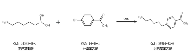 1.通过正己基硼酸和对氯苯乙酮合成对己基苯乙酮,收率约99%;