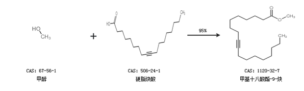 1.通过甲醇和硬脂炔酸合成甲基十八酸酯-9-炔,收率约95%;