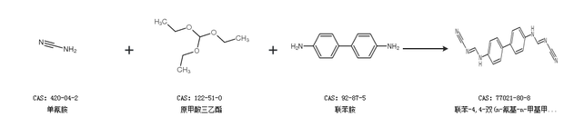 1.通过单氰胺、原甲酸三乙酯和联苯胺合成联苯-4,4-双(n-氰基-n-甲基甲脒)