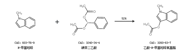1.通过N-甲基吲哚和碘苯二乙酸合成乙酸-N-甲基吲哚氧基酯,收率约76%;