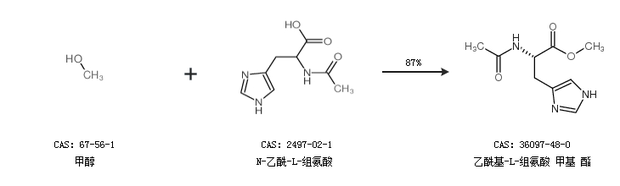 1.通过甲醇和N-乙酰-L-组氨酸合成乙酰基-L-组氨酸 甲基 酯,收率约87%;