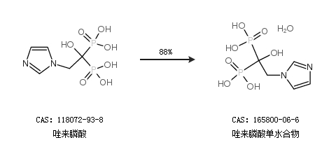 1.通过唑来膦酸合成唑来膦酸单水合物,收率约88%;