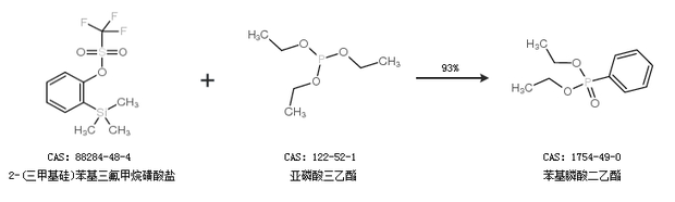 2.通过2-(三甲基硅)苯基三氟甲烷磺酸盐和亚磷酸三乙酯合成苯基膦酸二乙酯,收率约93%;
