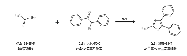 1.通过硫代乙酰胺和2-溴-2-苯基乙酰苯合成2-甲基-4,5-二苯基噻唑,收率约99%;