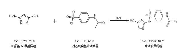 1.通过3-氨基-5-甲基异唑和对乙酰胺基苯磺酰氯合成醋磺胺甲噁唑,收率约80%;