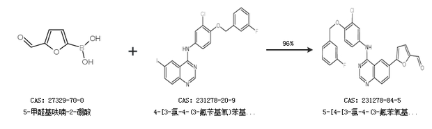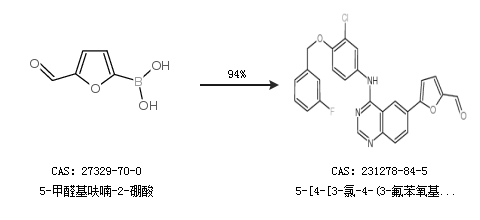 2.通过5-甲醛基呋喃-2-硼酸合成5-[4-[3-氯-4-(3-氟苯氧基)苯胺基]-6-喹唑啉基]呋喃-2-甲醛,收率约94%;