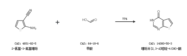 2.通过2-氨基-3-氰基噻吩和甲酸合成噻吩并[2,3-d]嘧啶-4(3H)-酮,收率约77%;