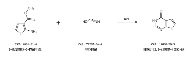 1.通过2-氨基噻吩-3-羧酸甲酯和甲亚胺酸合成噻吩并[2,3-d]嘧啶-4(3H)-酮,收率约67%;