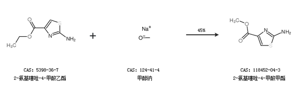 1.通过2-氨基噻唑-4-甲酸乙酯和甲醇钠合成2-氨基噻唑-4-甲酸甲酯,收率约45%;