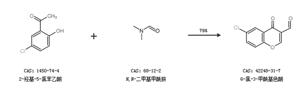 1.通过2-羟基-5-氯苯乙酮和N,N-二甲基甲酰胺合成6-氯-3-甲酰基色酮,收率约79%;