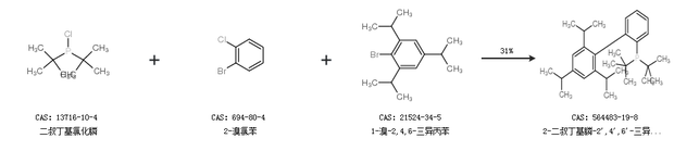 1.通过二叔丁基氯化膦、2-溴氯苯和1-溴-2,4,6-三异丙苯合成2-二叔丁基膦-2'',4'',6''-三异丙基联苯,收率约31%;