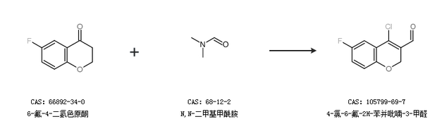 1.通过6-氟-4-二氢色原酮和N,N-二甲基甲酰胺合成4-氯-6-氟-2H-苯并吡喃-3-甲醛