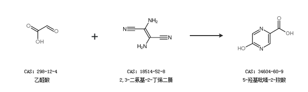 1.通过乙醛酸和2,3-二氨基-2-丁烯二腈合成5-羟基吡嗪-2-羧酸
