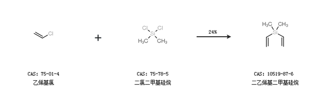 1.通过乙烯基氯和二氯二甲基硅烷合成二乙烯基二甲基硅烷,收率约24%;