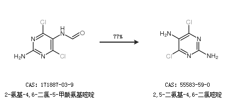 2.通过2-氨基-4,6-二氯-5-甲酰氨基嘧啶合成2,5-二氨基-4,6-二氯嘧啶,收率约77%;