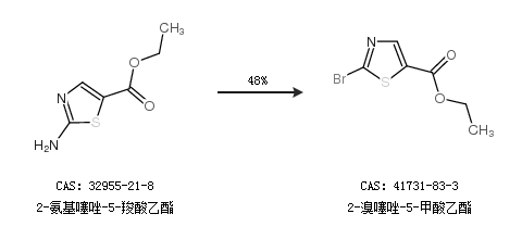 1.通过2-氨基噻唑-5-羧酸乙酯合成2-溴噻唑-5-甲酸乙酯,收率约48%;