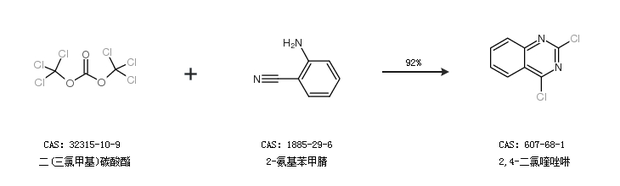 2.通过二(三氯甲基)碳酸酯和2-氨基苯甲腈合成2,4-二氯喹唑啉,收率约92%;
