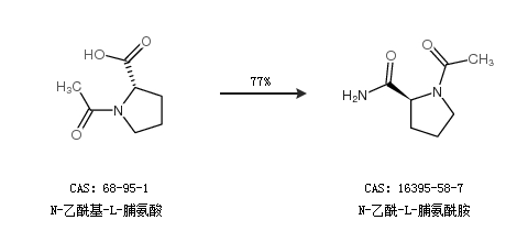 1.通过N-乙酰基-L-脯氨酸合成N-乙酰-L-脯氨酰胺,收率约77%;