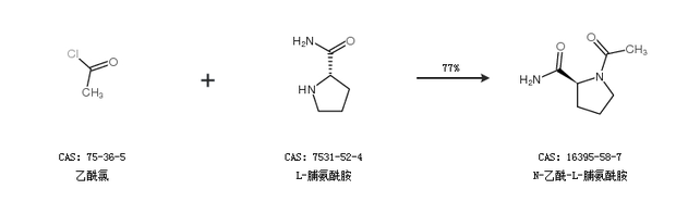 2.通过乙酰氯和L-脯氨酰胺合成N-乙酰-L-脯氨酰胺,收率约77%;