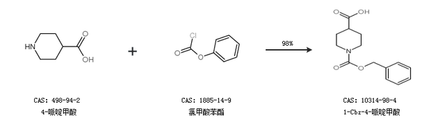 2.通过4-哌啶甲酸和氯甲酸苯酯合成1-Cbz-4-哌啶甲酸,收率约98%;