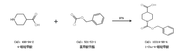 1.通过4-哌啶甲酸和氯甲酸苄酯合成1-Cbz-4-哌啶甲酸,收率约97%;