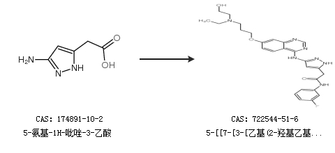 2.通过5-氨基-1H-吡唑-3-乙酸合成5-[[7-[3-[乙基(2-羟基乙基)氨基]丙氧基]-4-喹唑啉]氨基]-N-(3-氟苯基)-1H-吡唑-3-乙酰胺