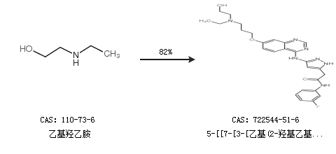 1.通过乙基羟乙胺合成5-[[7-[3-[乙基(2-羟基乙基)氨基]丙氧基]-4-喹唑啉]氨基]-N-(3-氟苯基)-1H-吡唑-3-乙酰胺,收率约82%;