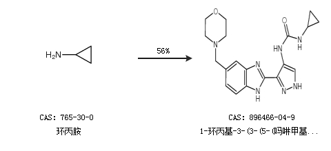 1.通过环丙胺合成1-环丙基-3-(3-(5-(吗啉甲基)-1H-苯并[d]咪唑-2-基)-1H-吡唑-4-基)脲,收率约56%;