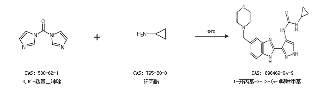 2.通过N,N''-羰基二咪唑和环丙胺合成1-环丙基-3-(3-(5-(吗啉甲基)-1H-苯并[d]咪唑-2-基)-1H-吡唑-4-基)脲,收率约38%;