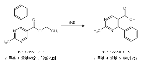 1.通过2-甲基-4-苯基嘧啶-5-羧酸乙酯合成2-甲基-4-苯基-5-嘧啶羧酸,收率约84%;