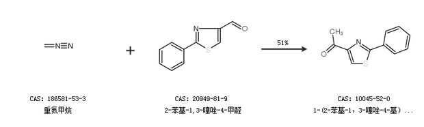 2.通过重氮甲烷和2-苯基-1,3-噻唑-4-甲醛合成1-(2-苯基-1,3-噻唑-4-基)乙酮,收率约51%;