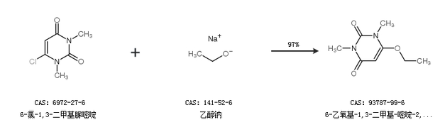 2.通过6-氯-1,3-二甲基脲嘧啶和乙醇钠合成6-乙氧基-1,3-二甲基-嘧啶-2,4-二酮,收率约97%;