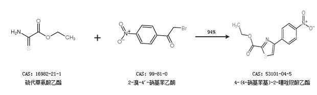 1.通过硫代草氨酸乙酯和2-溴-4''-硝基苯乙酮合成4-(4-硝基苯基)-2-噻唑羧酸乙酯,收率约94%;