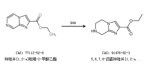 1.通过咪唑并[1,2-a]吡嗪-2-甲酸乙酯合成5,6,7,8-四氢咪唑并[1,2-a]吡嗪-2-甲酸乙酯,收率约94%;