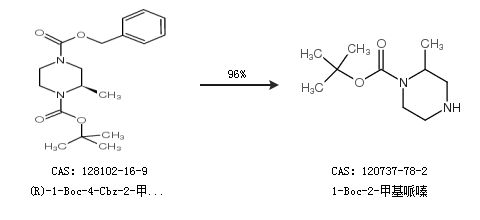 1.通过(R)-1-Boc-4-Cbz-2-甲基哌嗪合成1-Boc-2-甲基哌嗪,收率约96%;