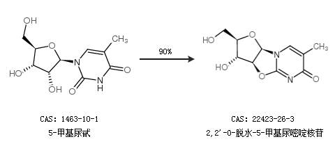 1.通过5-甲基尿甙合成2,2''-O-脱水-5-甲基尿嘧啶核苷,收率约90%;