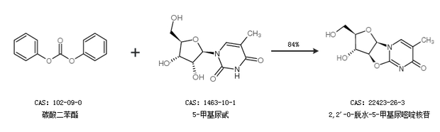 2.通过碳酸二苯酯和5-甲基尿甙合成2,2''-O-脱水-5-甲基尿嘧啶核苷,收率约84%;