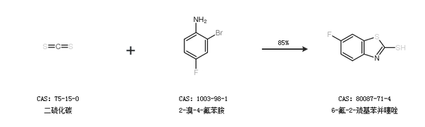 2.通过二硫化碳和2-溴-4-氟苯胺合成6-氟-2-巯基苯并噻唑,收率约85%;