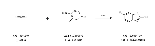 1.通过二硫化碳和2-碘-4-氟苯胺合成6-氟-2-巯基苯并噻唑,收率约86%;