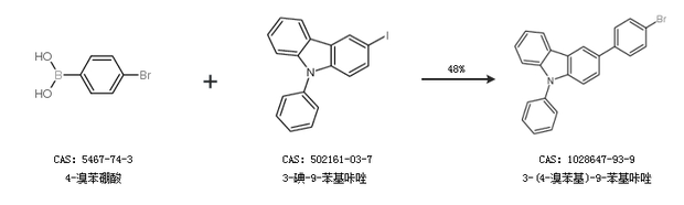 2.通过4-溴苯硼酸和3-碘-9-苯基咔唑合成3-(4-溴苯基)-9-苯基咔唑,收率约48%;