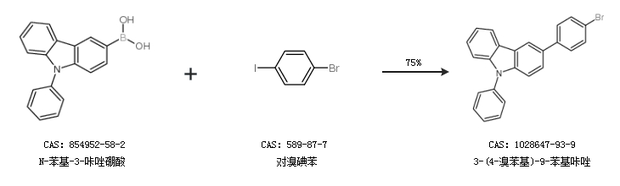 1.通过N-苯基-3-咔唑硼酸和对溴碘苯合成3-(4-溴苯基)-9-苯基咔唑,收率约75%;