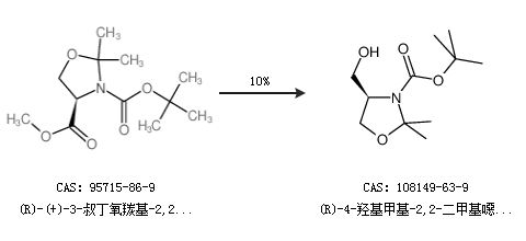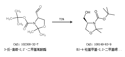 1.通过(R)-(+)-3-叔丁氧羰基-2,2-二甲基-4-噁唑烷羧酸甲合成(R)-4-羟基甲基-2,2-二甲基噁唑啉-3-羧酸叔丁酯,收率约10%;
