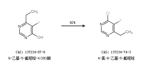 1.通过6-乙基-5-氟嘧啶-4(3H)酮合成4-氯-6-乙基-5-氟嘧啶,收率约92%;