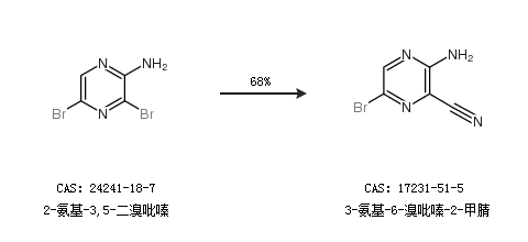 2.通过2-氨基-3,5-二溴吡嗪合成3-氨基-6-溴吡嗪-2-甲腈,收率约68%;