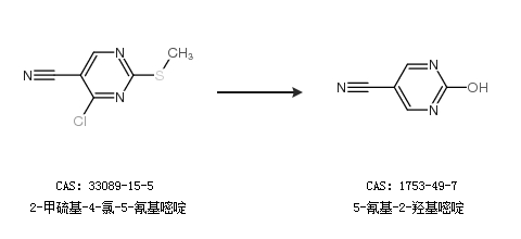 2.通过2-甲硫基-4-氯-5-氰基嘧啶合成5-氰基-2-羟基嘧啶