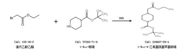 1.通过溴代乙酸乙酯和1-Boc-哌嗪合成1-Boc-4-乙氧基羰基甲基哌嗪,收率约99%;