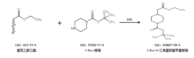 2.通过重氮乙酸乙酯和1-Boc-哌嗪合成1-Boc-4-乙氧基羰基甲基哌嗪,收率约83%;